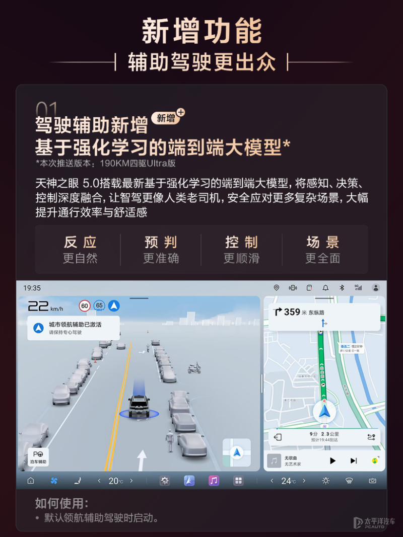 具体来看,本次OTA升级后将推送天神之眼 5.0端到端大模型(仅限于190KM四驱Ultra版车型),全场景智能通行能力的显著提升,更从容地应对城中村人车混行、施工改道至对向车道等复杂城市场景。同时优化了两车道及以下掉头、多路口环岛通行等难点场景的通过策略。