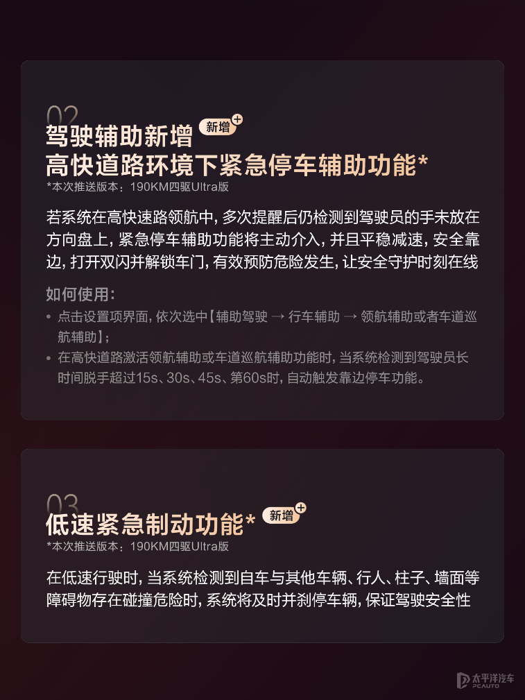 除上述主要新增功能外,本次OTA还包含一系列细致的体验优化,如支持生成和分享驾驶辅助报告、服务区下电后自动恢复导航、优化冰箱防误触逻辑、提升泊车辅助与自动紧急制动性能、改善辅助驾驶跟停策略、扩展语音控制范围等。(文:太平洋汽车 吴启星)