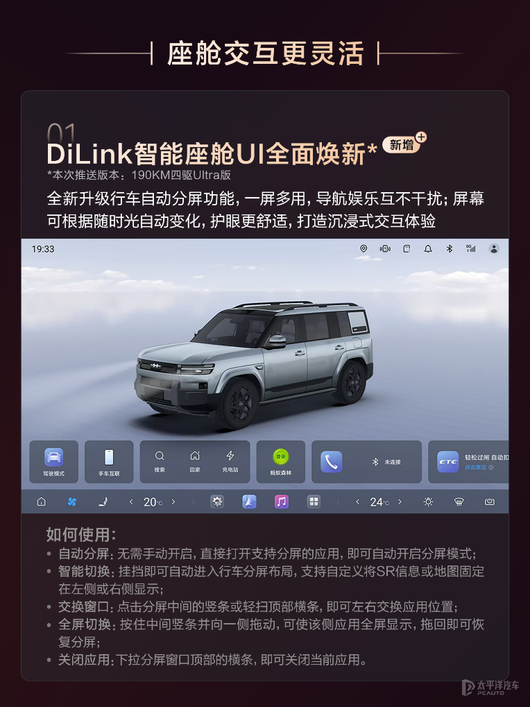 此外,DiLink智能座舱UI全面升级,强化了行车自动分屏功能,确保信息获取与娱乐互不干扰。新增多场景联动盲区浮窗影像功能,能在变道、转弯等关键时刻自动呈现关键视野,提升驾驶信心。